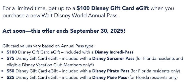 The maximum $100 incentive will, of course, be awarded when you purchase the top of the line Disney Incredi-Pass. Of note, everyone who does not live in Florida or are not part of Disney Vacation Club will have to purchase this pass. If you purchase the Disney Pixie Pass, which is the cheapest option and contains the most blackout dates, you will receive a $25 eGift card.