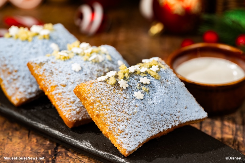 - Festive Beignets: Light and fluffy beignets dusted with blue sugar cookie dust and served with cookie butter icing (Available during Mickey’s Very Merry Christmas Party only)