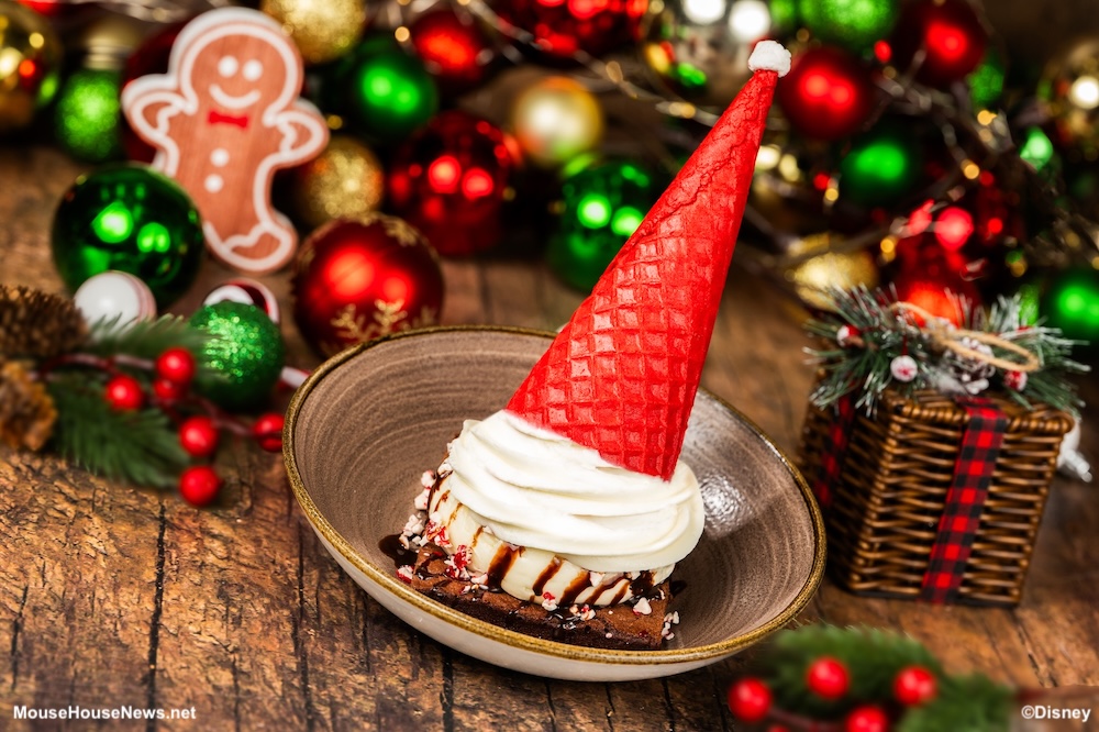 - Santa Hat Brownie Sundae (NEW): Brownie topped with vanilla ice cream, hot fudge, crushed peppermint, whipped cream, and a red velvet cone with a marshmallow pompom (available during Mickey’s Very Merry Christmas Party only)