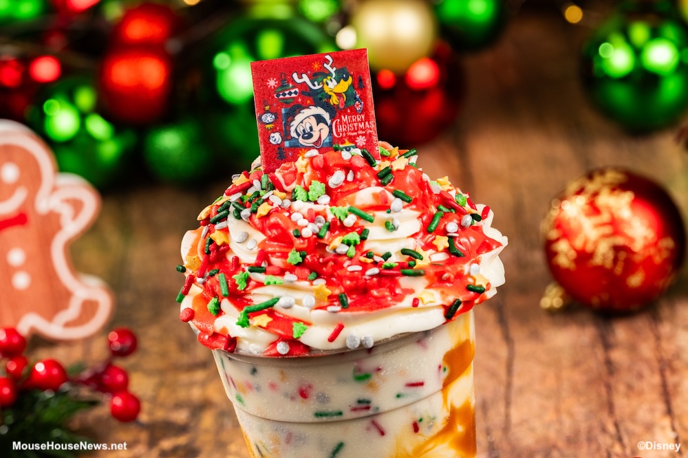 - Milk and Cookies Shake (NEW): Vanilla shake with caramel, holiday cookies, and chocolate chip cookie dough topped with whipped cream and festive sprinkles (non-alcoholic) (Available during Mickey’s Very Merry Christmas Party only)
