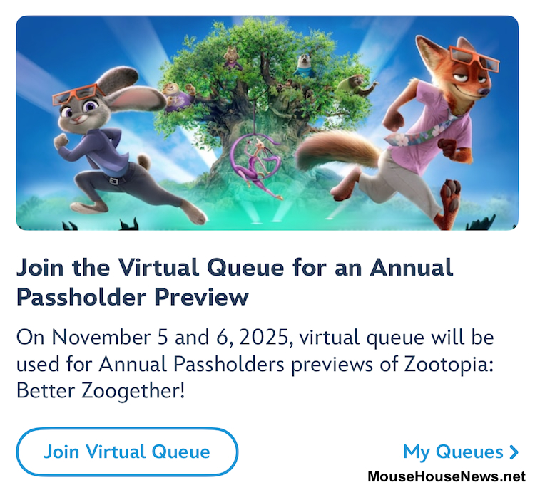 Today and tomorrow are your opportunities as a passholder to experience Zootopia: Better Zoogether! for yourself before the general public. It will operate using a virtual queue system, which is already live in the My Disney Experience app. So, if you are a passholder and are able to visit Animal Kingdom today or tomorrow, here’s your chance!