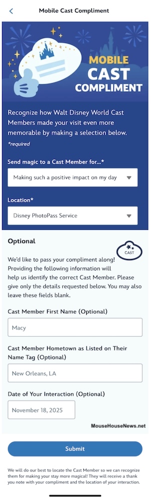 At this point, you can tell Disney who made your day and how they did it. Be sure to take a look at the Cast Member’s name tag to find out their name and where they are from! That information really helps pinpoint who should get the recognition. Compliments can be made for any Cast Member at resorts, parks, dining, and merchandise locations!