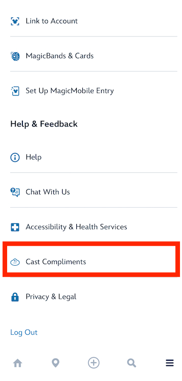 Cast Compliments are essentially little “thank yous” that you are passing along to Disney. Disney receives these compliments, then passes them on to the Cast Members so they can get the recognition they deserve. You can easily give a Cast Compliment in the MyDisneyExperience app. Simply tap on the sandwich button (the button in the lower right corner that looks like 3 stacked horizontal lines), then scroll to the bottom and tap Cast Compliments.