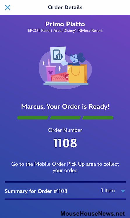 When your order is ready, the app will send a push alert to your device. The alert will tell you where to go to pick up your food. Show the Cast Member your order number, they’ll give you your food, and you’ll be on your way. Super simple!