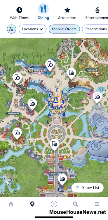 You can also check Mobile Order availability from the map in the MyDisneyExperience app. This is especially convenient if you’re inside one of the theme parks. Tap on the “Dining” section located right next to Wait Times at the top of the map. The map will then populate the restaurants in that park. The Mobile Order symbol will designate the ones that offer Mobile Ordering. Tap on the symbol, and the name of the restaurant will pop up along with a “Begin Order” option. One you hit “Begin Order”, the app takes you to the same screen where you selecting an arrival window. The rest of the process is the same. Easy peasy.