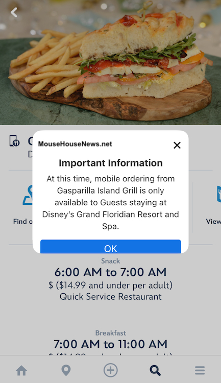 There are a couple of important things worth mentioning about Mobile Ordering, however. First, the arrival windows can fill up quickly, especially at popular locations and during peak meal times. Additionally, resort locations will sometimes offer Mobile Ordering only to guests staying at those resorts. This is especially true of restaurants on the monorail loop. Thankfully, the app will pop up an alert in these situations to make users aware of the limitation.