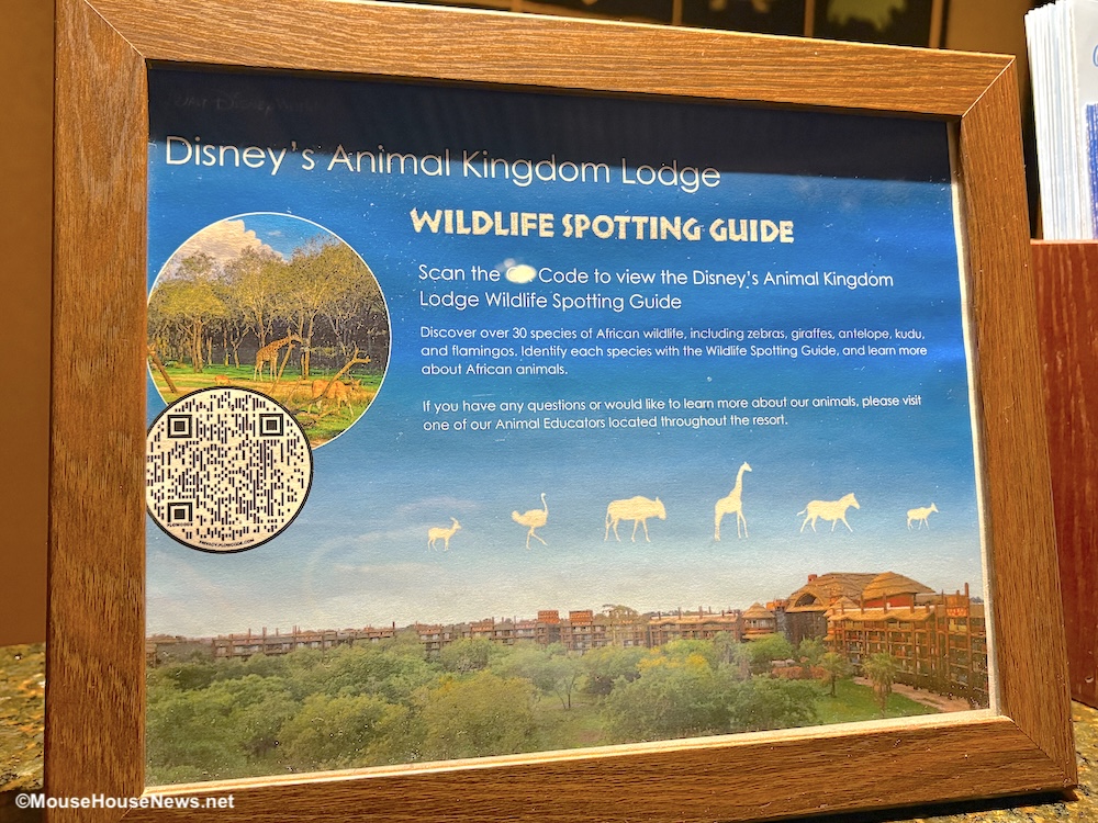 Even if you’re not staying at Animal Kingdom Lodge, you can visit one of the public savanna overlook areas. Disney states that the resort’s savannas are home to over 200 birds and hoofed animals! Each of the savannas has a different combination of animals, so depending on which overlook you visit, you may see a different species each time. If you want to identify the animals or learn more information, Disney provides a scannable QR code to access a Wildlife Spotting Guide. During select times of day, there will also be Cast Members stationed near the overlooks. Definitely stop by to say hello and ask questions. They are an unparalleled source of knowledge!