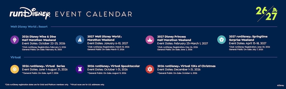Here are the 2026 – 2027 runDisney events, their dates, and the dates when registration for the general public starts:
