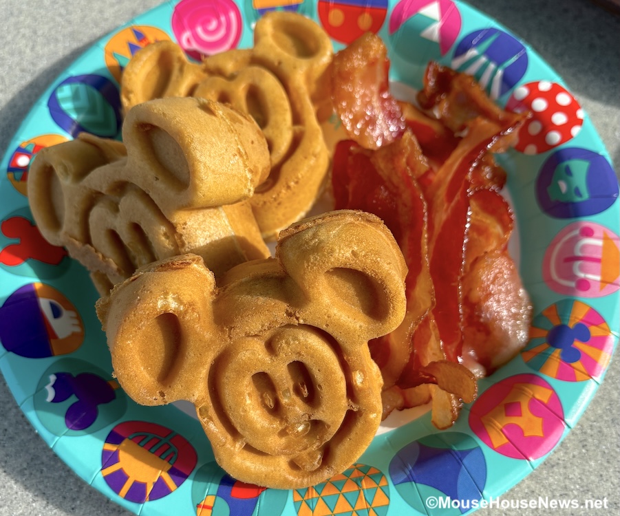 You can order Mickey-shaped Waffles in a couple of different ways. First, as a standalone entrée with a side of bacon and/or sausage. Here’s a pro tip: you can ask for double bacon instead of sausage if you prefer. Another way to get a Mickey-shaped Waffle is by ordering a Waffle Bounty Platter. Bounty Platters typically come with scrambled eggs, potato barrels, bacon, sausage, and a single Mickey-shaped waffle. Bounty Platters sometimes go by other names depending on the restaurant, so be on the lookout!