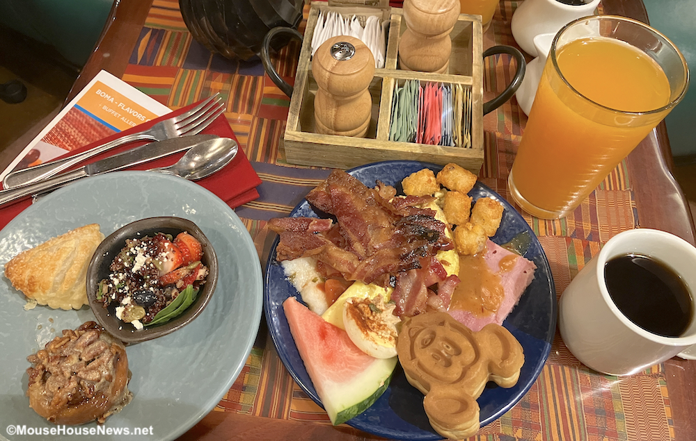 Perhaps the ultimate breakfast of champions is my favorite, breakfast at Boma – Flavors of Africa. I have lovingly mentioned Boma before, and I will keep singing its praises! Boma is a buffet restaurant at Disney’s Animal Kingdom Lodge. The restaurant offers a wide variety of breakfast options including familiar favorites and African-inspired options. There are soooo many options here that it would be impossible to list them all (and choosing a singular favorite item is difficult). However, one delicacy I will suggest you must try are the sticky buns. Honestly, these alone are worth a visit!