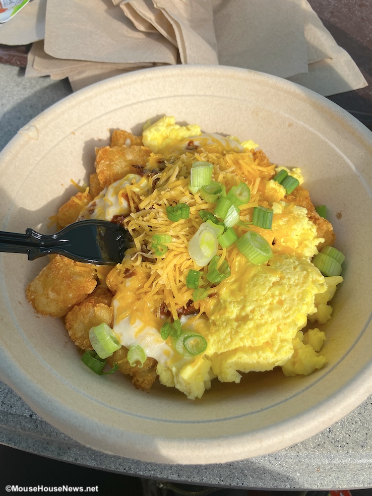 Keep an eye out for versions with slight variations. As an example, one of my favorite quick services, The Mara at Disney’s Animal Kingdom Lodge, offers what they call a Kilimanjaro Bowl. This bowl has the typical potato barrels, scrambled eggs, cheddar cheese, sausage gravy, and bacon, but also includes chakalaka (a South African vegetable relish).
