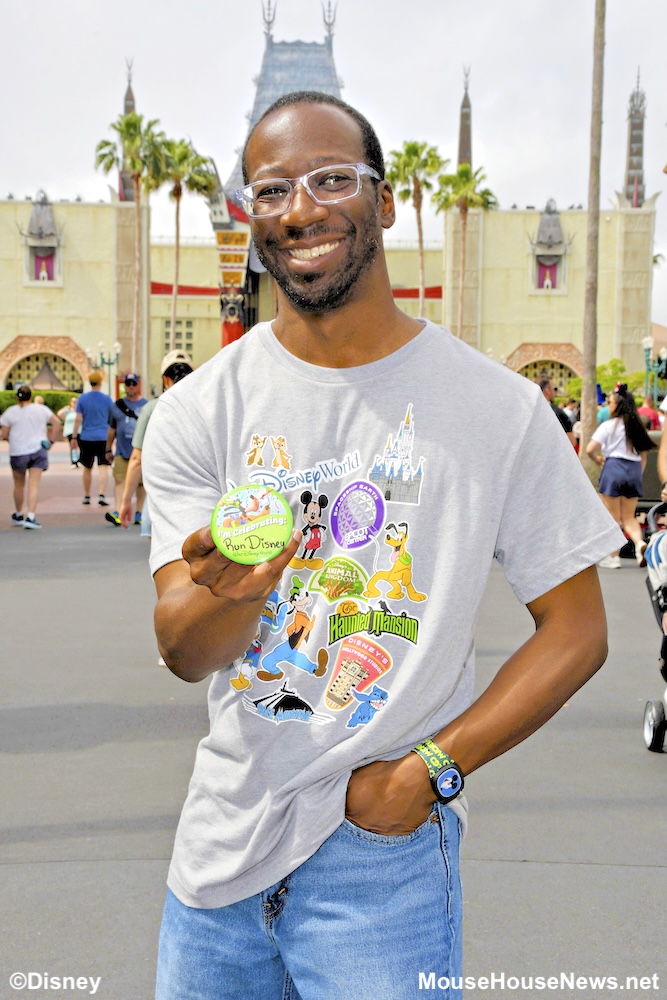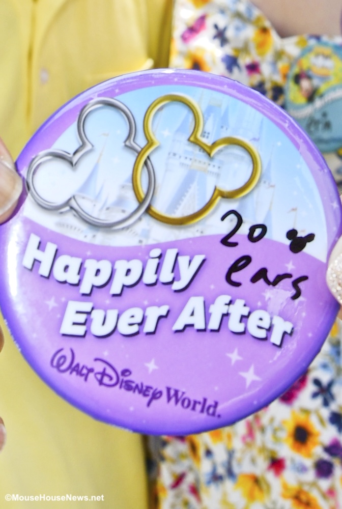 You can request a celebration button at your resort’s front desk, Guest Services at any of the theme parks, or most merchandise locations. The Cast Member will be able to personalize your button by writing on it with a marker at that time. Here’s a tip: if they don’t cover the writing with a piece of scotch tape at the time of personalization, you may want to do so yourself. We’ve found out the hard way that Celebration Button + marker + sunscreen = marker rubbing off of the button. The MouseHouseNews.net team has taken to bringing a roll of tape in our luggage just in case we need it.