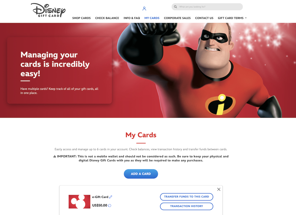 To transfer balances to a single card, you’ll need to purchase an e-gift card first. Then, you can transfer the balance from your other gift cards onto that e-gift card at DisneyGiftCard.com.